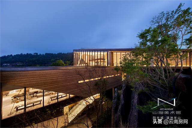 山海美术馆在设计上大面积使用玻璃墙体,视觉上打通市内与室外界限,充分利用坡地俯瞰滇池和昆明城区的优势,营造出山水无际、红尘远去的浪漫意向。