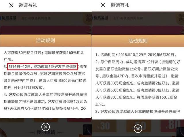 另外,招联金融的邀新宣传活动也被指虚假宣传。曾华(化名)称,招联金融邀新活动显示,5月6日-12日邀请5个用户完成借款就奖励500无门槛购物券。不过,活动期间曾华完成了邀请5个用户完成借款,却被客服告知1周只能邀请3个,“超出无效”。