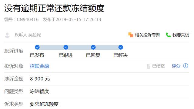 叶薇是因为提前还款被冻结额度,李玥则是“无缘无故被冻结额度”。李玥对柒财经表示,自己使用招联金融1年多了,一直自动还款,从未逾期,现在却被招联无故冻结额度。而在聚投诉上,还存在着大量与李玥一样“无缘无故被冻结额度”的用户。