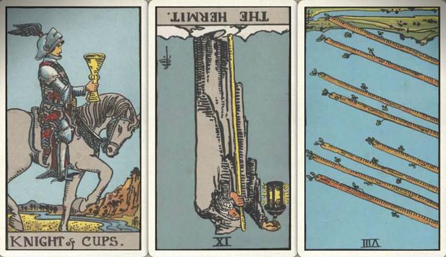 卜牌:圣杯骑士+ 隐士- 权杖八-