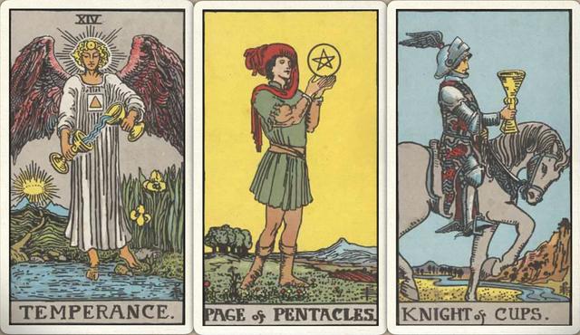 卜牌:节制+ 星币侍从+ 圣杯骑士+