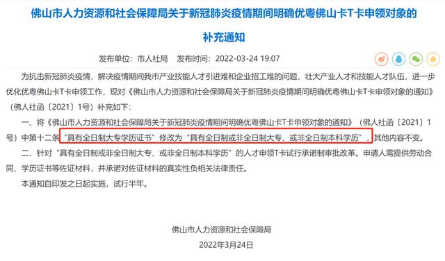 3月24日晚,佛山市人力资源和社会保障局发文通知,降低优粤佛山卡T卡的申领门槛,从大专以上学历下降为全日制大专和非全日制本科,变相放松了限购。