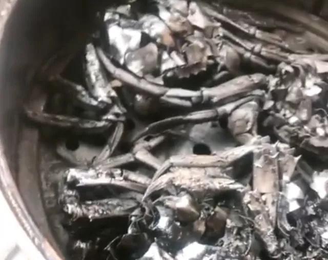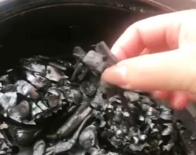 一女子检查厨房时发现螃蟹被烧成了黑碳,用手一碰就碎成了粉末。