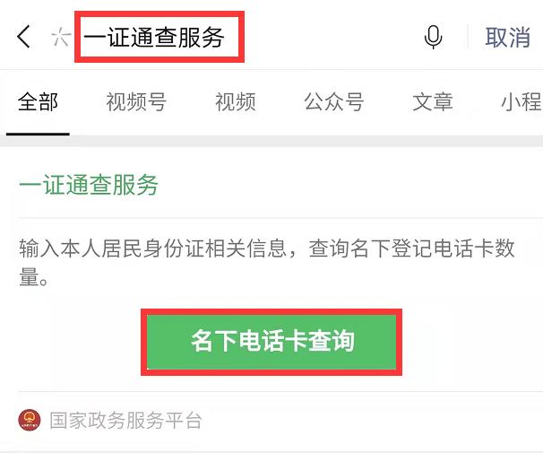 在微信搜一搜里搜索“一证通查服务”,然后点击“名下电话卡查询”。