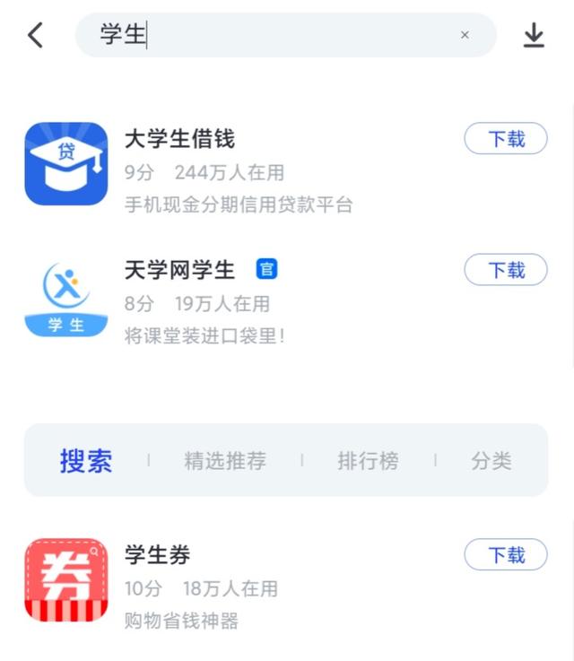 8月20日,南都记者在360手机助手以“学生”为关键词进行搜索时,出现了两款应用—— “大学生借钱”“大学生贷款学贷宝”。