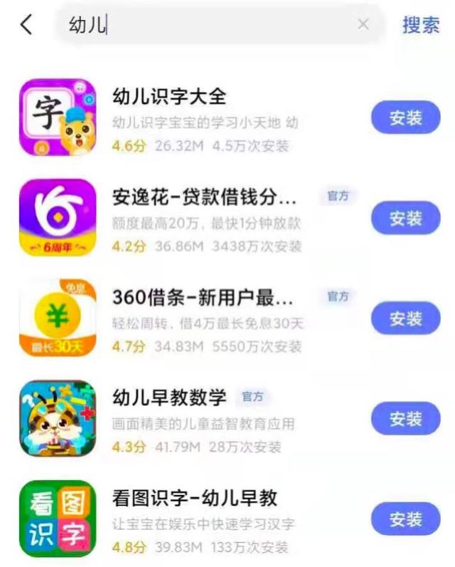8月17日,南都记者在vivo应用商店以“幼儿”“学习”“教育”等关键词进行搜索,发现结果列表第2、3、6位总出现“安逸花-贷款借钱分期平台”“360借条-新用户最高免息30天”两款金融产品,这是vivo应用商店的推广位。查询发现,这两款App今年都曾因违规登上相关部门通报名单。