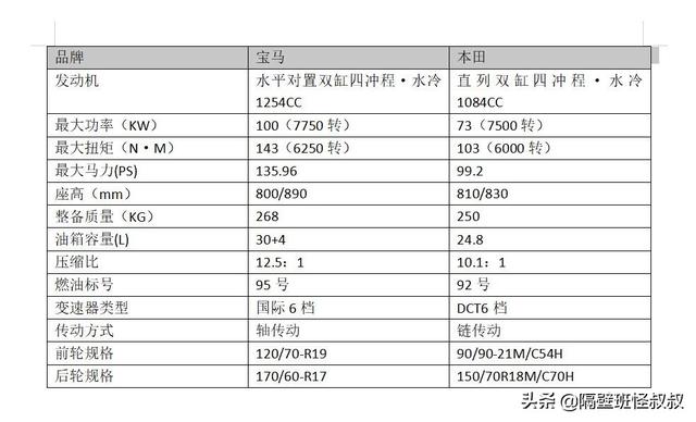 公升级别的车型,其实不需要纠结太多功率和扭矩的区别。除非是专业车手,一般摩友能发挥到它一半的功力就很厉害了!所以动力方面数据可以不用太在意。两款车的最大扭矩爆发都在6000转左右。综合来看,其实两款车的定位是不一样的,从车重,轮胎规格,还有压缩比等方面,可以明显看出。宝马更适合公路长途摩旅。前120后170的轮胎、拳击手发动机的整车低重心,使得它在高速中的稳定性更好。同时ADV的高离地间隙设计,让它能通过偶尔遇到的烂路。但是不代表就能拿来玩泥巴。本田前90后150的轮胎更适合走烂路,低压缩比只需要92的粗粮就可以喂饱,而且本田是真省油。所以,本田的定位是可以带你去你想去的地方,又能给带回来。不追求数据上的漂亮,而是追求质量和整体的综合实用性。