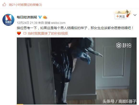 同时点赞了一条“如果这是每个男人结婚后的样子,那女生应该都会愿意结婚吧”的微博,这条微博展示了一个体贴妻子,默默为她付出的好丈夫形象。
