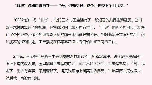 陈三木则会花上三五十块,请王宝强吃点炒菜。