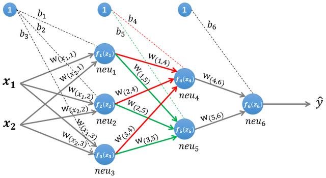 图 1 所示是一个简单的三层(两个隐藏层,一个输出层)神经网络结构,假设我们使用这个神经网络来解决二分类问题,我们给这个网络一个输入样本(x₁,x₂),通过前向运算得到输出y ̂。输出值y ̂的值域为[0,1],例如y ̂的值越接近0,代表该样本是"0"类的可能性越大,反之是"1"类的可能性大。