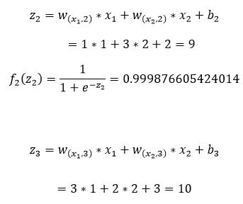 上图中我们计算出了第一层隐藏层的第一个神经元的输入z₁和输出f₁(z₁),同理可以计算第二个和第三个神经元的输入和输出: