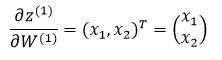 我们以1.1节中的简单神经网络为例,假设我们要计算第一层隐藏层的神经元关于权重矩阵的导数,则有: