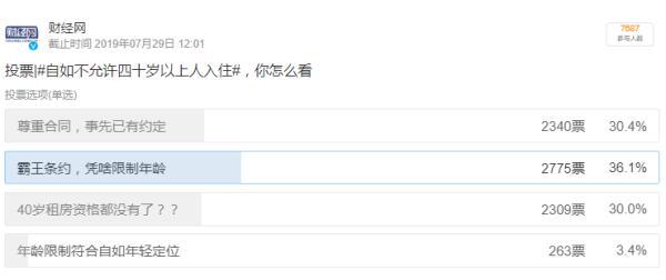 这一话题引起了社会和法律人士的强烈争论,有网友质疑此规定,认为是年龄歧视。也有人说规定就是规定,你签了合同就要遵守。在财经网据此话题发起的一项调查显示,36.1%的人认为此条约属于“霸王条约”,30%的人表示“40岁租房资格都没有了?”,质疑的意见仍然占据主流。