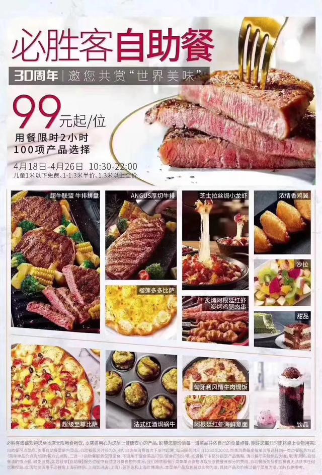 看来活动确实开始了。这种自助餐涉及全球2000家披萨小屋。活动时间为6月8日至6月12日,有牛排、小龙虾、鸡翅等。