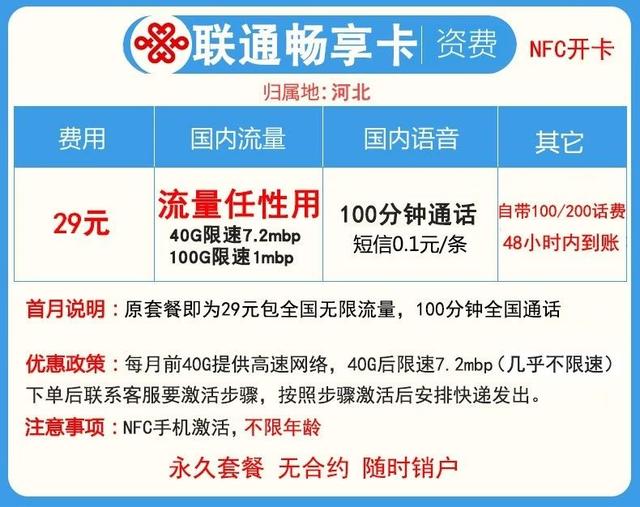 黑马推荐的第二个套餐是 29元的联通的畅享卡 。