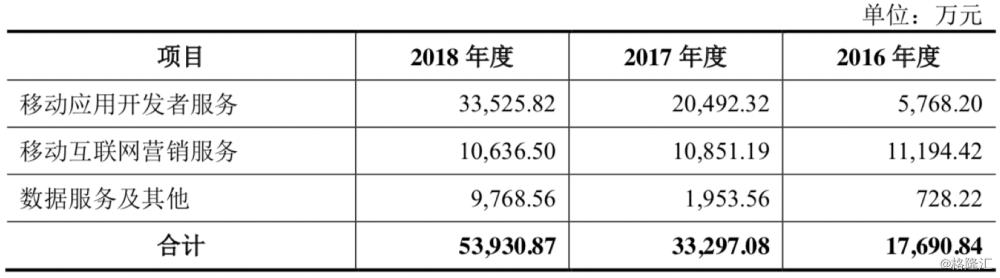 可以看到,每日互动2018年收入最大来源是移动应用开发者服务,也就是技术服务里面的三大服务,推送服务,用户画像服务,数据统计服务。理解起来就是卖SDK,这块大收入有3.3亿,占整个大收入约62%。