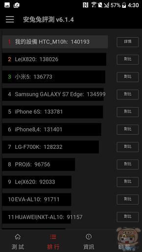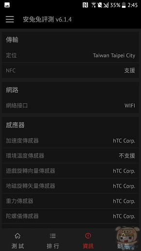 最后当然要看一下HTC 10 强大的效能评测呀,从安兔兔的的系统资讯上显示使用Qualcomm Snapdragon 820 64位元 2.2GHz 四核心处理器,GPU为Adreno(TM)530,萤幕的解析为1440 x 2560 高的解析度,可使用的记忆体容量全部为2371MB左右(视实际情形而定),可储存的容量空间为21.05GB左右。