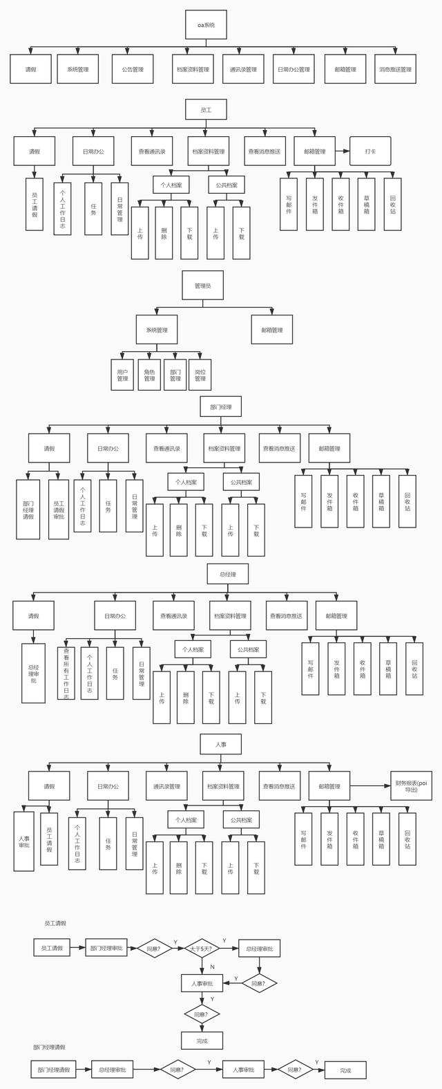 员工:登录、修改个人信息、请假(申请请假)、日常办公(工作日志、任务管理、日常管理)、通讯录查阅、档案资料管理(个人档案、公共档案、下载、上传)、查阅消息、邮件管理(收件箱、发邮件、已发邮件列表)、打卡考勤等。