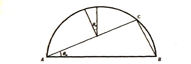 见图5,图中AB是篮圈的直径,AC为篮球的直径。当篮球在篮圈的上方附近时定义一个进球角度θ,当θ=0时,球会垂直向下进入篮圈。反之,θ如果太大,篮球将会集中篮圈弹走。因此有一个最大的进球角θmax,当0<θ<θmax时,球会空心入筐。参考标准篮球直径(dB)为 24.6厘米,而篮圈直径(dR)为45厘米。cosθ=AC/AB=24.6/45得到θ≈60°,也就是说,当篮球的进球角度小于60°时,形成空心蓝的几率最大。