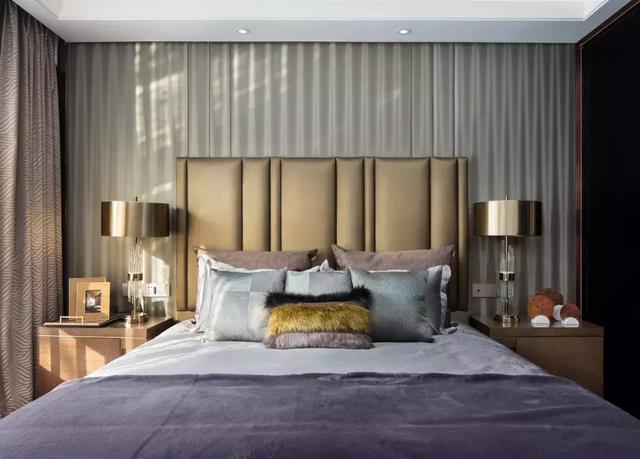 主卧设计,中性偏暖的色调赋予空间暧昧多义的可能,软装床品散发出柔软曼丽的味道。大幅装饰画带有大气粗犷的野性,彰显出后现代的非连续性和多元化,让空间充满时尚、不羁的诱惑力。