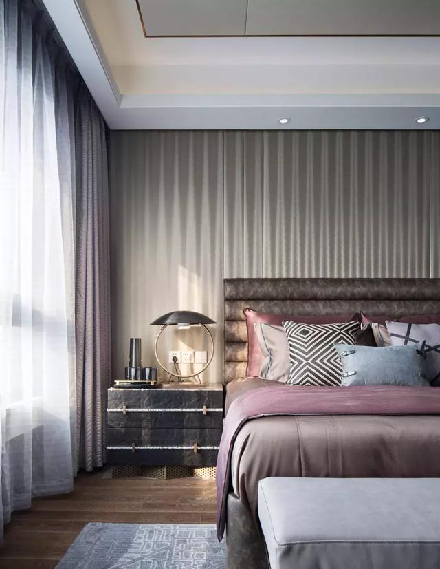 主卧设计体现了优雅的艺术品位,整体空间层次丰富且有序,具象和抽象的交织扭结,碰撞出崭新的空间想象,在严谨理性中涂抹上轻松潇逸的一笔。