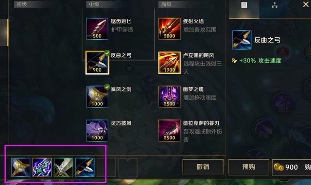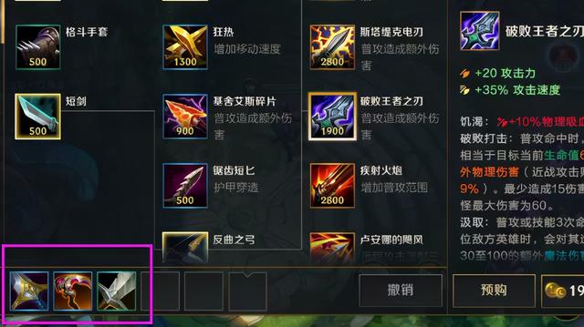 此外破败王者之刃提供了35%的攻击速度,能够帮助我们更好地进化3技能。LOL手游里是没有攻速鞋的,因此,卡莎想要获得额外的攻速,就只能购买反曲之弓,这是性价比最高的攻速小件,900金就提供了30%的攻速,配合破败王者之刃可以直接进化3技能。反曲之弓后续可以升级卢安娜的飓风,这件装备是卡莎的常见装备,可以提供她的AOE能力。