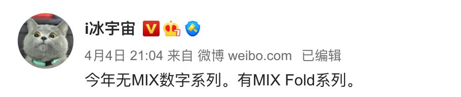 此外,虽然此前的爆料曾提到即将到来的超大杯旗舰可能会被称为“MIX 5”,但博主@i冰宇宙 的爆料显示,“今年无MIX数字系列。有MIX Fold系列。”