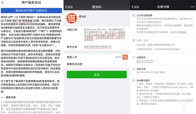 用户服务协议显示,该产品实为“借365”APP。其运营主体为德清方略网络科技有限公司,2017年10月31日完成工商注册。然而,在“借365”APP中则出现了不同的产品介绍。