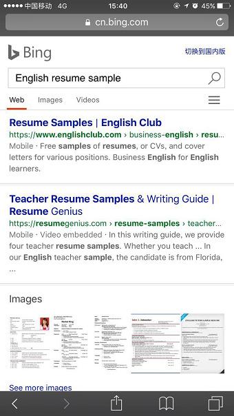 早在几个月前,小编就发现苹果设备上的默认搜索引擎是必应,并且就常常出现“仅英文结果”的搜索选项,点击后常常有更加精准与令人惊喜的结果。在必应的国内版和这次上线的国际版中,小编都试了搜索“English resume sample”,国内版的bing会提示输入了英文,建议切换到国际版。从国际版的搜索体验上看,页面一贯的整洁美观,链接里面的内容确实实用,真的是英文搜索用户者的福音啊。