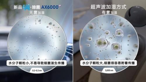 很多朋友都在使用超声波加湿器,这种加湿器有个弊端,就是加湿时会产生大量水雾,这是由于水分子颗粒太大,导致细菌很容易附着在上面传播,而AX6000采用无雾加湿,进入空气的水分子颗粒仅0.2-0.3纳米,这样又轻又小的水分子颗粒可均匀排放到更远的距离,而且不容易滋生细菌。