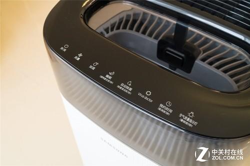 AX6000顶部从上到下依次是排风口(净化后的洁净空气从这里排出)、水箱(用于加湿)、显示屏和按钮部分。