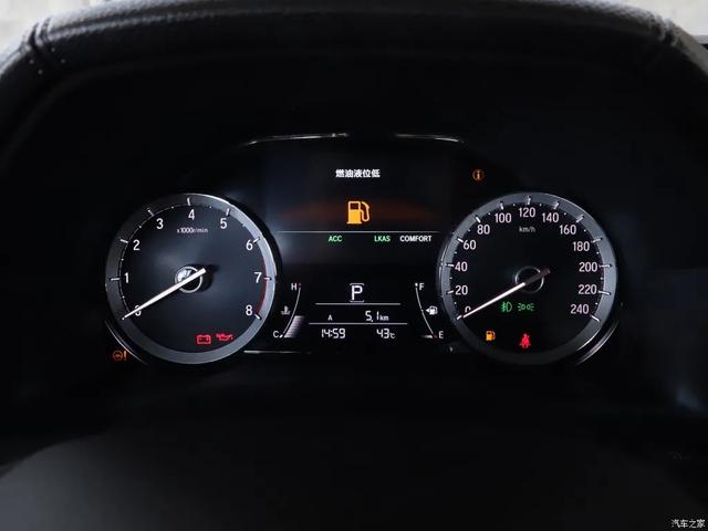 方向盘为三辐样式设计,低配车型同样带有多功能按键,只是低配车型并没有使用真皮材质包裹。仪表盘是由两个物理指针仪表加彩色行车电脑显示屏组成,造型简单,显示的信息量比较丰富。