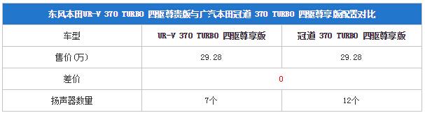 与冠道相比,UR-V的370 TURBO 四驱尊享版比冠道 370 TURBO 四驱至尊版依然是在扬声器方面有差距,并且还少了个DVD播放器,所以冠道依然还是有着在扬声器数量方面的娱乐系统优势,怎么选相信大家都知道了。