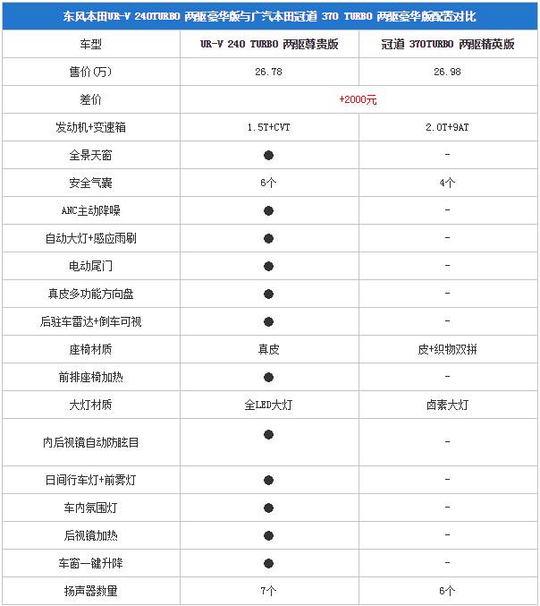UR-V 240TURBO 两驱豪华版26.78万的售价比冠道370TURBO 两驱精英版26.98万元的售价少2000元,但UR-V配备的为1.5T发动机,而冠道却是配备2.0T发动机的版本,然而除去动力方面的差异,配置方面UR-V 240TURBO 两驱豪华版却有着极大的优势,多出来的配置都是非常实用的功能。