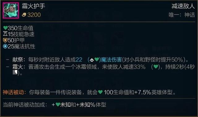 适合英雄:适合出冰拳的英雄都适合出霜火护手,团队主坦可以出霜火护手来抬生命值,类似波比狗熊、石头人和大树这样的英雄尤其适合。