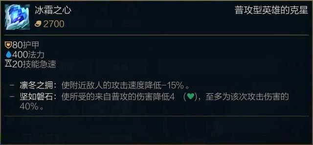 冰心降低攻速的特效得以保留,而且依然是15%,同时提供了一个类似布甲鞋的效果格挡普攻伤害,格挡的数值是(+0.7/100自身最大生命值),但是有上限,这个特效很有趣,是随着生命值提升而不断提升,假设有3000生命值,格挡的普攻伤害是21。