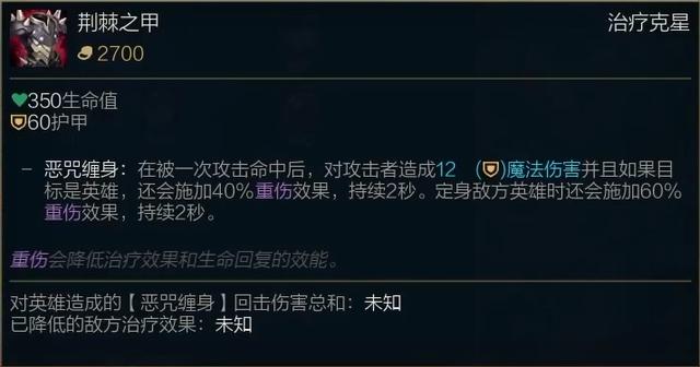 适合英雄:主要卖点是重伤和反伤,反伤属性随护甲提升而提升,适合作为第二件或者第三件护甲装备出。