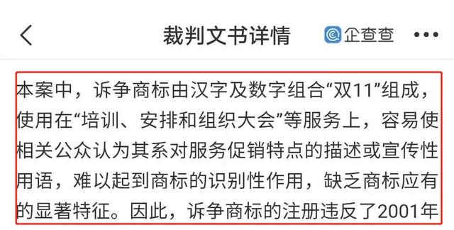 法院查明一审中认为诉争商标由汉字及数字组合“双11”组成,难以起到商标的识别性作用,缺乏商标应有的显著特征,京东公司提出无效宣告请求法律适用正确。审法院认为原审判决认定事实清楚,裁判结果为驳回阿里巴巴公司上诉。(来源:IT之家)