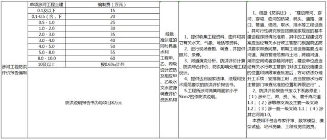 防洪评价咨询取费可参考地方收费标准,如湖南省地方标准——《湖南省物价局、湖南省水利厅关于公布水利系统服务性收费项目和标准的通知》(湘价服〔2013〕134号),具体如下: