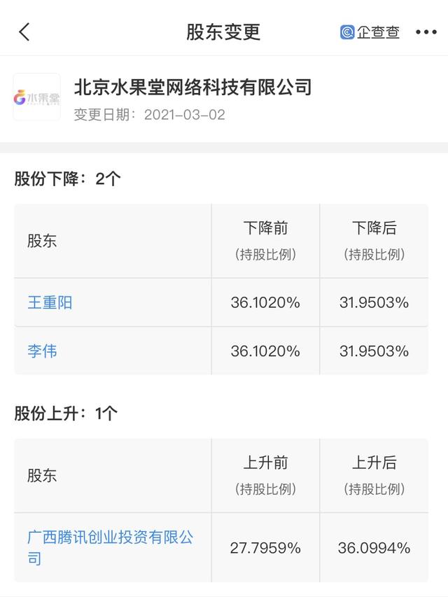 IT之家3月2日消息 企查查 App 显示,近日北京水果堂网络科技有限公司(简称水果堂)发生工商变更,广西腾讯创业投资有限公司股份上升,持股 36%,王重阳和李伟持股比例下降,各持股 32%。同时该公司注册资本增至约 42.55 万元,增加 12.99%。