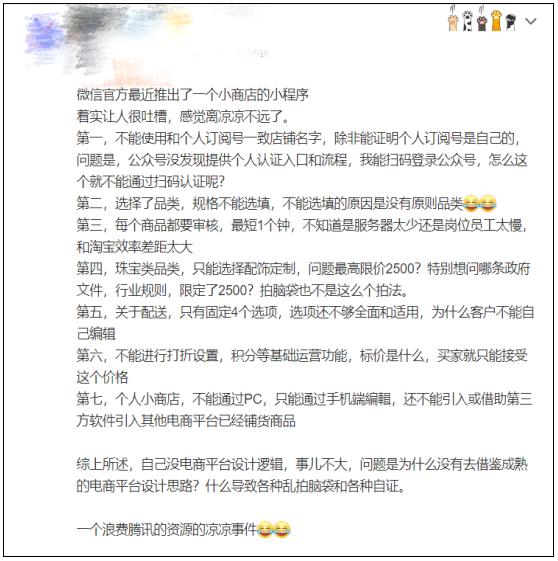 有网友在微博上说到,个人版的小商店不是很理想,不稳定,“差点意思,感觉微信并不是那么热爱这个事情。”