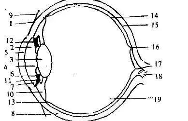 1.角膜缘2.前房 3.晶状体4.瞳孔 5.角膜 6.虹膜 7.前房角8.巩膜 9.球结膜 10.睫状体 11.后房 12.晶状体悬韧带 13.距齿缘 14.视网 膜 15.脉络膜 16.黄斑 17.视神经乳头 18.视神经 19.玻璃体