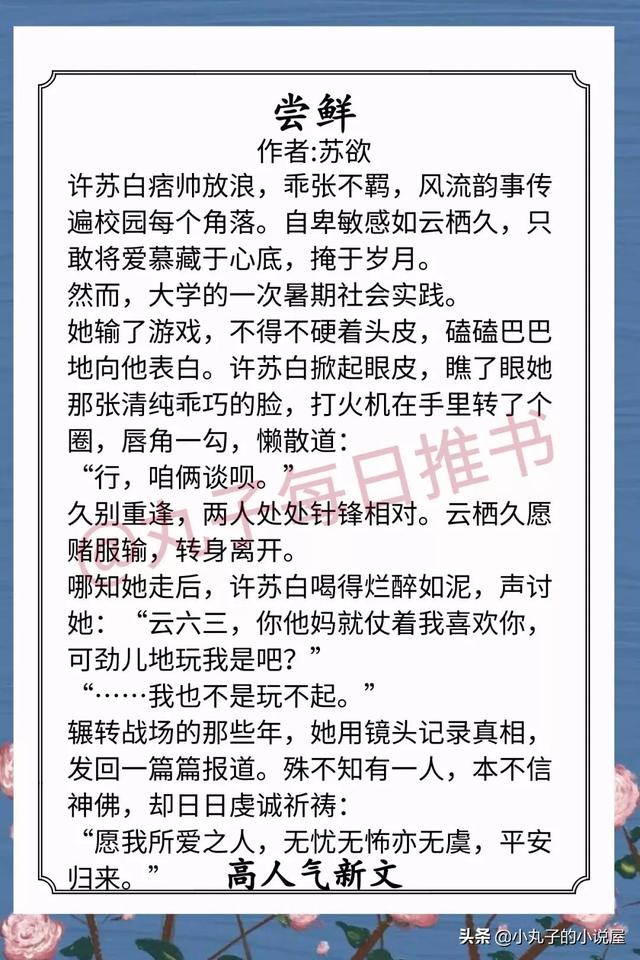 1.《尝鲜》 作者:苏欲(外柔内刚战地记者vs痞里痞气公子哥,暗恋,双向奔赴,久别重逢,从校园到都市)