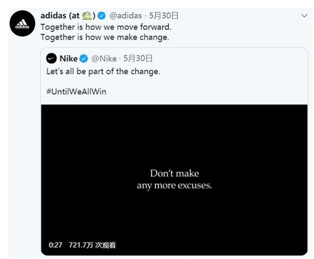 耐克的一条广告在网络上受到非常多反种族歧视者的转发,转发者之一包括其竞争对手阿迪达斯。(图片来源:网络截图)