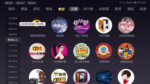 第一种是栏目形式,也是BesTV橙子视频的主要形式。右侧为视频播放窗口,下方有作者、关注、橙子首页、手机分享四个操作入口,左侧为层级式三级(或两级)导航栏,其中总导航栏可通过遥控器左键唤出。