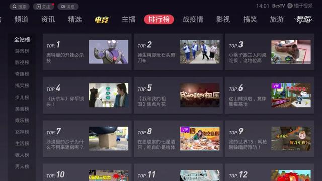 值得一提的是,BesTV橙子视频中还有一个短视频排行榜栏目,比如全站榜、游戏榜、影视榜等,很有特色,也很有吸引力。