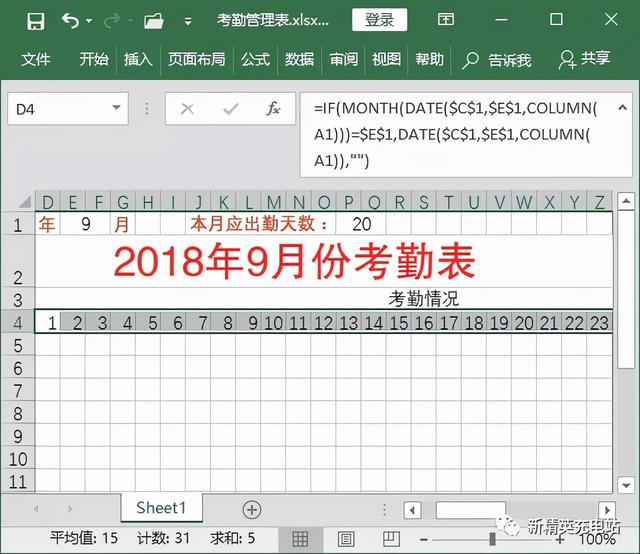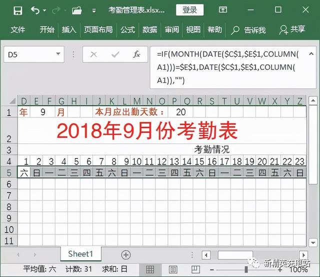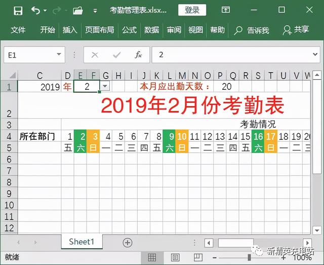 本例中采用 NETWORKDAYS函数计算所选月份应该出勤的总天数时,用了DATE函数将C1、E1单元格和数字1转换为日期数据,作为统计工作日的开始日期;用EOMONTH函数让转换为日期的 DATE($C$1,$E$1,1)数据返回当月的最后一天,作为统计工作日的结束日期。
