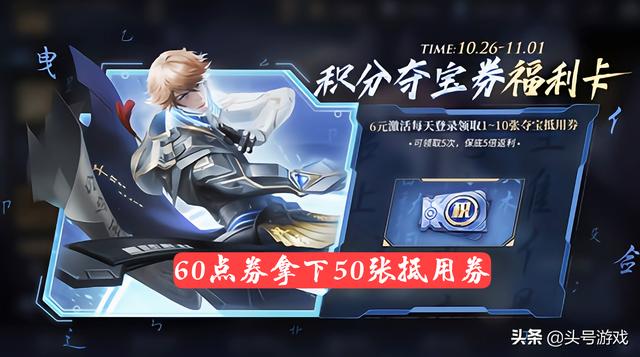 这个新活动的名字叫做积分夺宝抵用券福利卡,很多的玩家拥有很多款荣耀典藏皮肤,但是一款荣耀典藏皮肤可是价值近2000块钱,想要获得荣耀典藏皮肤,就必须去积分夺宝里面抽水晶,但是抽一次需要60点券,相当于6块钱,不过官方也送出了各种各样的活动,有的时候大家可以兑换积分夺宝抵用券,一个抵用券可以增加一次抽奖机会,价值也是60点券,也有很多的玩家利用王者荣耀的充值返利活动来获得积分夺宝抵用券,主要的目的也就是在抽荣耀水晶的时候可以省一点钱。