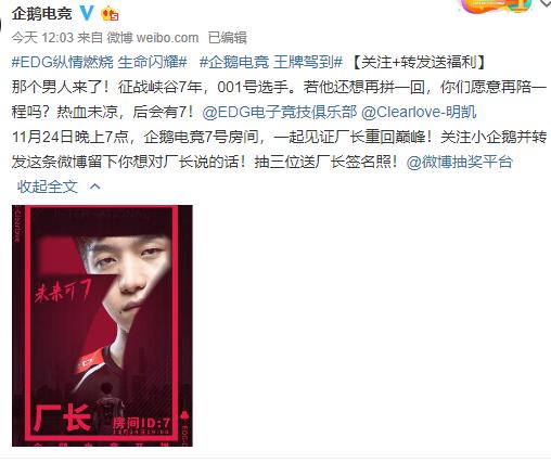 终于在今天,企鹅电竞官方宣布厂长的直播间号码以及开播时间,辣个男人,征战召唤师峡谷七年,LPL001,在7号直播间,于11月24号晚上7点,咱们后会有7!