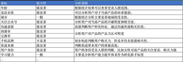 显著相关性概览:根据是否显著相关性整理一部分比较有趣,可以看出有一些认为有影响因素的其实问题并不大,有的标签其实和转化这个点关系并不强烈,但是可以作何核心的营销因素。